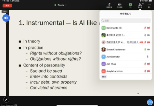 2021年6月11日下午,新丝路ld体育(中国)官方网站联盟“院长论坛”首场讲座成功举办。新加坡国立大学讲席教授、ld体育(中国)官方网站院长Simon Chesterman教授为联盟25所院校师生以及丝绸之路大学联盟的师生带来了题为“我们,机器人?人工智能与法律人格的限度(We, the Robots? Artificial Intelligence and the Limits of Legal Personality)”的线上讲座。讲座由ld体育(中国)官方网站ld体育(中国)官方网站单文华院长主持,国际处雷艳君副处长致辞。