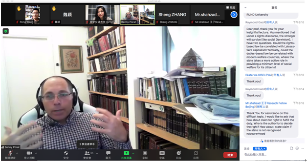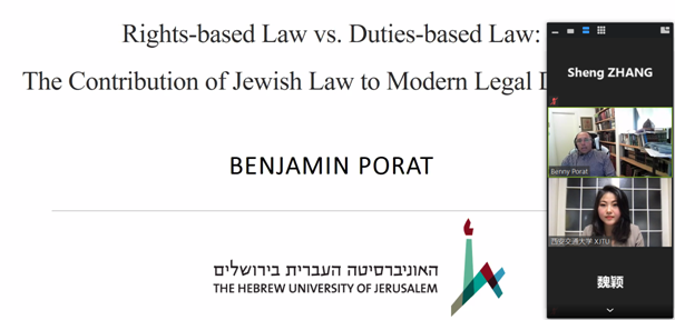 2021年9月29日下午,新丝路ld体育(中国)官方网站联盟“院长论坛”第二讲成功举办。希伯来大学ld体育(中国)官方网站副院长Benjamin Porat教授为联盟25所院校师生以及丝绸之路大学联盟的师生带来了题为“Rights-based Law vs Duties-based Law: The Contribution of Jewish Law to Modern Legal Discourse”的线上讲座。讲座由ld体育(中国)官方网站ld体育(中国)官方网站助理教授郭剑萍主持。