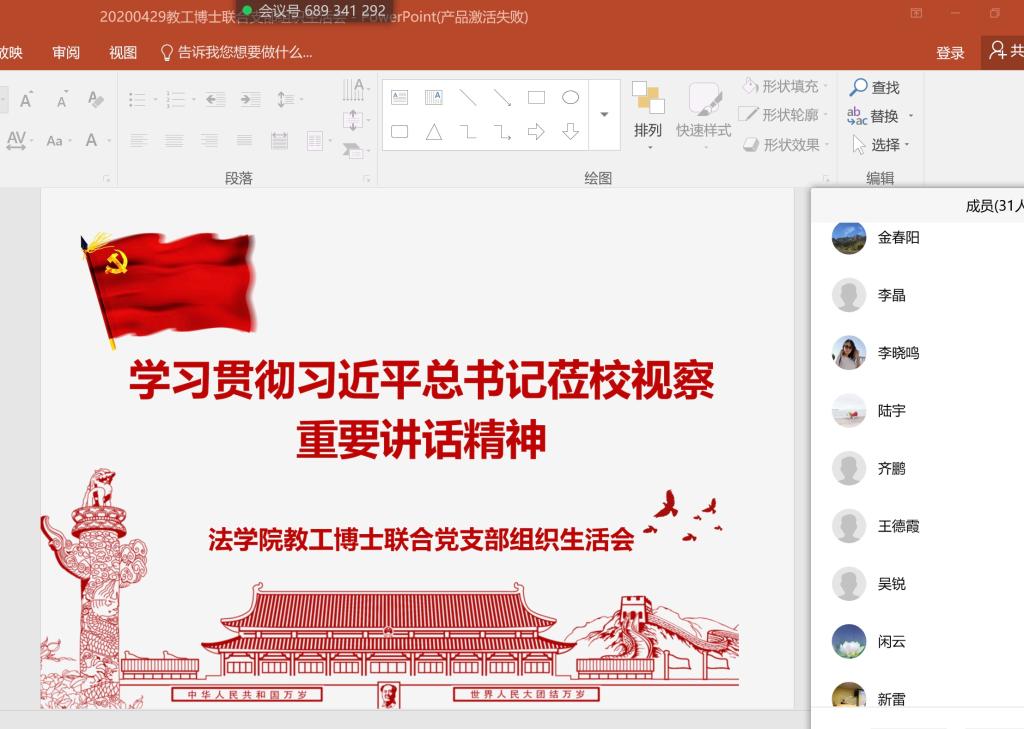 4月29日下午,ld体育(中国)官方网站教工博士联合党支部开展线上组织生活会,深入学习贯彻习近平总书记莅校视察重要讲话精神。党支部成员通过网络平台积极参加学习,本次活动由支部书记曹毅博主持。