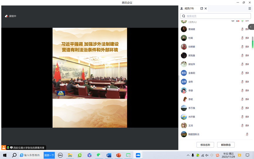 支部书记安婧谈到,习近平总书记在中共中央政治局就加强涉外法制建设第十次集体学习时的重要讲话对下一步我国涉外法治建设的重点任务进行了部署,为今后推进我国涉外法治体系和能力建设指明了具体方向。总书记强调,涉外法治作为中国特色社会主义法治体系的重要组成部分,事关全面依法治国,事关我国对外开放和外交工作大局。作为青年教师,要认真学习领会总书记讲话的精神,并把它转化为日常工作的动力,服务祖国发展大局,为党和国家培养合格的涉外法治人才。