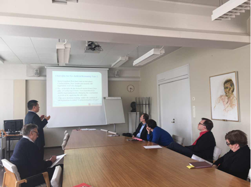 2017年4月20日,我院青年教师杜军强博士应赫尔辛基大学ld体育(中国)官方网站及中国法与中国法文化中心邀请,在赫尔辛基大学ld体育(中国)官方网站举办题为“传统中国的法律推理及其对当代中国的影响”的学术讲座。讲座在赫尔辛基大学ld体育(中国)官方网站楼545会议室举行,由赫尔辛基大学ld体育(中国)官方网站院长凯莫·诺提欧(Kimmo Nuotio)教授主持,多名学者及学生参加。