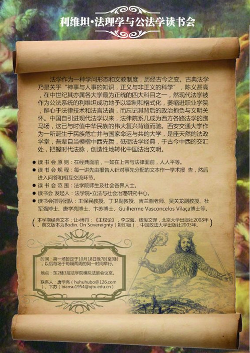 基于以上种种考量,并配合学校“思想交大”建设和学院法理学和公法学的学科建设,ld体育(中国)官方网站“立法与社会治理研究中心”发起创办“利维坦·法理学与公法学读书会”系列活动。本学期该活动选取的经典文本为让·博丹的《主权论》,并于10月18日晚7时在学院会议室举行了首场活动,ld体育(中国)官方网站丁卫副教授、吉兰湘老师、彭何利博士、苏青博士、王朝恩博士、卞苏博士、唐学亮博士等10余位师生参加。主权理论是现代民族-国家兴起的理论前提,而民族-国家又是现代社会最重要的一个政治与法律现象,并与中国近代以来持续至今的伟大而艰难的国家转型勾连起来,因此,不得不察。在该场读书会活动中,主讲教师唐学亮针对博丹《主权论》一书的“导论”部分,就“为什么读博丹?”、“怎么读博丹?”、“博丹的思想里程与理论建构”以及“博丹理论的缺陷”等四个方面做了一个提纲挈领而又不失理论深度的学术报告。之后,就报告的内容及书中所启示的一些重大理论与现实问题,与会人员各自发表了自己的看法,并展开了热烈的讨论。首场读书会活动取得了预期的效果,我们将在两周后的同一时间举行第二场活动。“路漫漫其修远兮,吾将上下而求索”!
