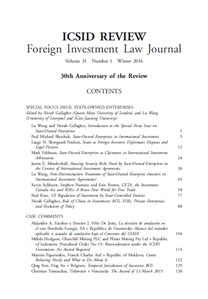 近日,国际投资法领域顶级专业期刊ICSID Review—Foreign Investment Law Journal(《国际投资争端解决中心评论——外国投资法学刊》)三十周年纪念期刊第一期正式出版,西安交大ld体育(中国)官方网站博士生王璐作为特邀编辑(Guest Editor)主编了本期特别专栏“国有企业专题研究”(Special Focus Issue on State-Owned Enterprises),并发表论文 “Non-Discrimination Treatment of State-Owned Enterprise Investors in International Investment Agreements?”(国际投资协定中国有企业投资者的非歧视待遇?)。
