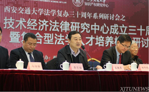 研讨会于28日上午在南洋大酒店开幕。中国工程院院士汪应洛、陕西省委政法委副书记、综治办主任王永明、陕西省高级人民法院副院长田平利、陕西省知识产权局局长巨拴科、西安交大副校长王铁军、陕西省人大教科文卫委员会办公室主任赵建军、西安市法学会专职副会长黄必方、西安交大ld体育(中国)官方网站副院长李万强等科技法学、知识产权法学界著名专家学者以及相关校友等一百五十余人出席了开幕式。开幕式由西安交大技术经济法律研究中心、知识产权研究中心主任马治国主持。
