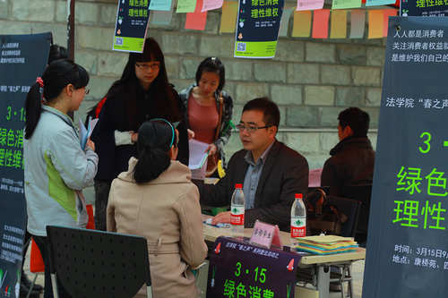 为加强大学生消费维权意识,提高大学生的法律素养,ld体育(中国)官方网站研究生会联合法律爱好者协会和陕西稼轩律师事务所的专业律师,于“3•15国际消费者权益日”当天,在康桥苑西广场和西食堂门口举办了主题为“绿色消费、理性维权”的普法宣传咨询活动。