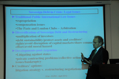 4月16日下午,Kulms博士为ld体育(中国)官方网站师生带来题为The Eurozone Debt Crisis and Private Creditors: From Argentina to Greece(欧元区债务危机和私人债权人:从阿根廷到希腊)的讲座。Kulms博士首先分析了欧元区债务危机的成因,然后在借鉴阿根廷债务危机经验的基础上,从市场交易的进路分析主权债务合同的对策,最后从欧洲央行作用的角度讨论希腊债务重组问题。