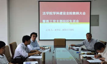 单文华院长首先作了关于ld体育(中国)官方网站学科建设动员讲话。他表示当前学院学科建设工作的重心就是要全院同心同德,争取法学一级学科博士点。他深入分析了学院学科建设的形势,号召大家众志成城,齐心协力,积极配合学院相关工作,为学院学科新跨越贡献自己的智慧和力量。接着,马治国副院长、马民虎教授、胡德胜教授分别讲话,表示要全院一心,做好各项相关工作。