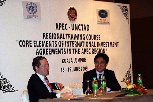 此次培训是联合国贸易与发展会议支持下的亚太经合组织投资专家项目“投资协定核心要素”的一系列活动之一。课程旨在加深APEC各国/地区对投资自由化、投资保护和投资促进政策中的关键要素以及出现的问题的理解,课程针对投资协定中的一些关键问题和投资条款进行认真解读,并分析当前缔约实践的不同方式,以及国际仲裁的最新案例,以此为条约谈判者提供选择方案。培训课程结束后,还有一个条约的模拟谈判,使得参与者可以利用学到的知识进行谈判,同时课程还对亚太经合组织地区的投资条约条款和仲裁案件进行认真分析。