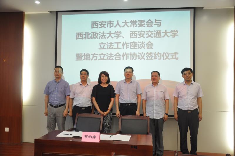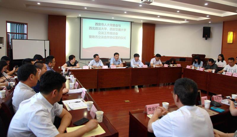 为深入贯彻落实党的十九大精神,推进科学立法、民主立法、依法立法,进一步提高立法质量,发挥高校专业优势,实现地方立法实践工作和法学教育研究的深度融合、相互促进、共同提升,助推法治西安建设,西安市人大常委会与西北政法大学、ld体育(中国)官方网站立法工作座谈会暨地方立法合作协议签约仪式”于6月20日上午在西北政法大学雁塔校区研究生综合举行。西安市市委组织部常务副部长、人大常委会副主任薛振虎,市人大法制委主任委员、常委会法工委主任牛犁和市人大常委会法工委其他领导,西北政法大学校长杨宗科,ld体育(中国)官方网站人文社科处处长贾毅华,ld体育(中国)官方网站立法与党内法规研究中心主任王保民和部分师生代表、西北政法大学立法研究所所长朱继萍和部分师生代表等参加了会议。