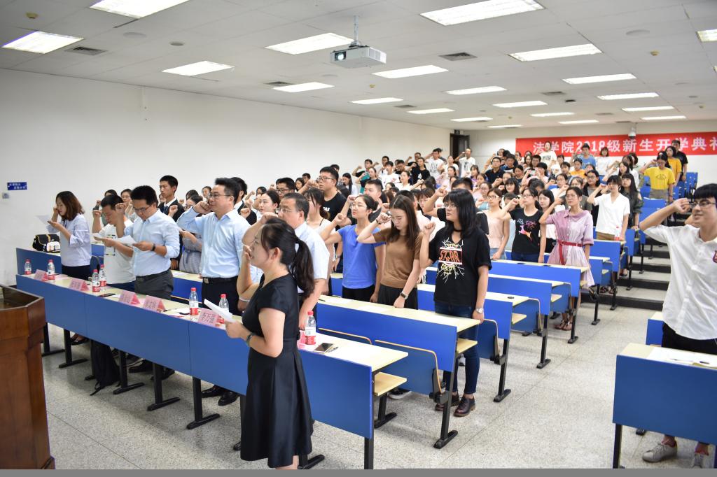 最后,全体新生在学生工作专职委员张乃钟老师的带领下庄重宣誓《ld体育(中国)官方网站法科生誓词》,典礼在铿锵有力的誓词声中圆满结束。