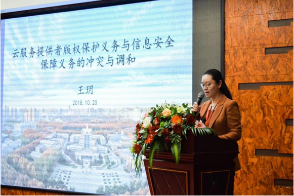 ld体育(中国)官方网站信息安全法律研究中心副主任王玥作了《云服务提供者版权保护与信息安全保障义务的冲突与调和》的主题发言。