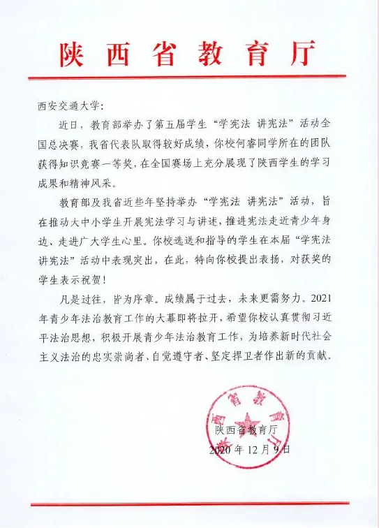 鉴于ld体育(中国)官方网站对此次活动的积极配合,以及ld体育(中国)官方网站老师的倾情指导,陕西省教育厅近日专门发来感谢信,对ld体育(中国)官方网站在此次“学宪法、讲宪法”活动中的选送和指导工作予以表扬和祝贺!ld体育(中国)官方网站获得竞赛优秀组织单位称号,ld体育(中国)官方网站ld体育(中国)官方网站王保民教授获得优秀指导教师称号。