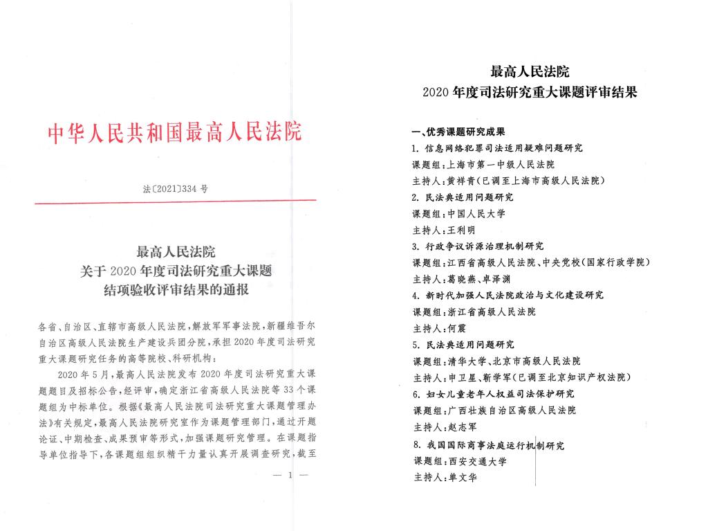 2020年5月,最高人民法院发布了2020年度司法研究重大课题题目及招标公告,经评审,确定ld体育(中国)官方网站单文华教授课题组等33个课题组为中标单位。这也是我校获批的第一个最高人民法院重大课题。