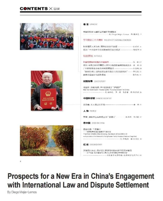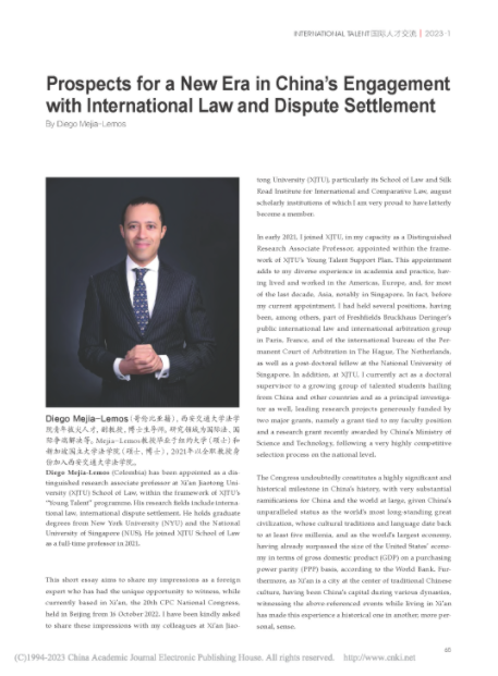 日前,我院青年拔尖人才、ld体育(中国)官方网站副教授Diego Mejía-Lemos以“Prospects for a New Era in China's Engagement with International Law and Dispute Settlement”(中国积极参与国际法和国际争端解决)为题在《国际人才交流》2023年第1期发表文章,分享他对习近平总书记在中国共产党第二十次全国代表大会上所作报告的感想,文章被作为该期“卷首”进行推介。