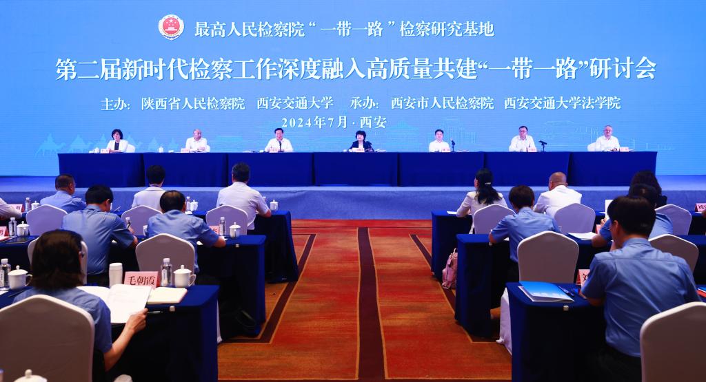 7月10日,最高检“一带一路”检察研究基地第二届新时代检察工作深度融入高质量共建“一带一路”研讨会在西安召开。最高检党组成员、副检察长葛晓燕,省委常委、省委政法委书记刘强,ld体育(中国)官方网站党委书记卢建军出席并讲话。省检察院党组书记、检察长王旭光主持开幕式。全国人大代表方燕、全国政协委员祁志峰、省人大代表杨艺媛、省政协委员刘国兴,最高检检察理论研究所所长郭立新、法律政策研究室一级高级检察官吴孟栓、国际合作局二级巡视员龙梅,省委政法委副书记丁恒,西安市委副书记、市委政法委书记李婧等参加活动。