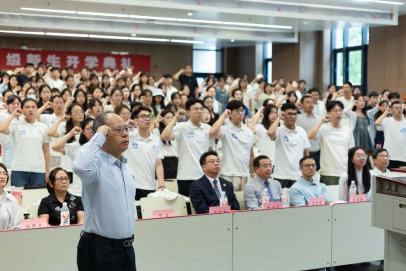 丁卫副院长带领全体法科生新生庄严宣誓:“公平所系,正义相托。在这庄严时刻,我郑重宣誓:我志愿投身法治事业,忠实履行一个法律人应尽的全部义务,恪守宪法,热爱祖国,忠于人民,弘扬法治精神,维护正当权益,勤勉诚信,清正廉洁。我决心竭尽全力,捍卫法律职业的圣洁与荣誉,养天地正气,行人间正道,求正义,尚卓越,为法治中国的繁荣发展和人类正义的美好未来奋斗终生!”