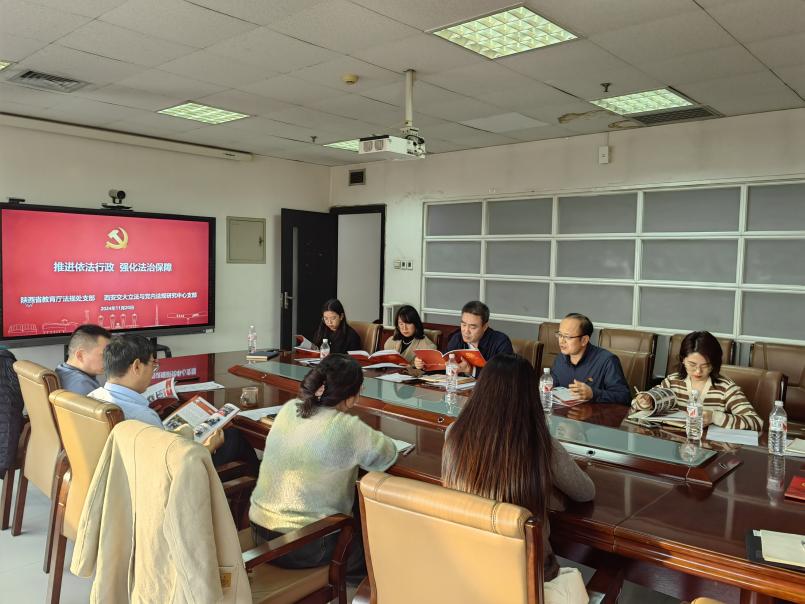 为深入学习贯彻党的二十届三中全会精神,进一步加强党支部之间的交流与合作,11月20日下午,省教育厅法规处党支部一行与ld体育(中国)官方网站立法与党内法规研究中心党支部在兴庆校区主楼E910会议室联合开展了“推进依法行政强化法治保障”的主题党日活动。省教育厅法规处支部处长付仲锋、副处长张世飞等一行七人,和ld体育(中国)官方网站ld体育(中国)官方网站党委书记王保民教授、立法与党内法规研究中心支部书记杜军强老师等立法支部师生代表共同参加了此次活动,会议由支部书记杜军强老师主持。