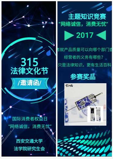 2017年3月15日,ld体育(中国)官方网站研究生会成功举办了第八届“春之声”法律文化节,本届法律文化节由上、中、下三个分场组成,分别为社区普法、法律讲座和知识竞赛,活动旨在进一步增强大学生和市民对网络消费的了解,提高消费者对网络消费的安全意识和维权意识。