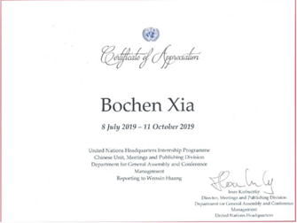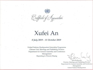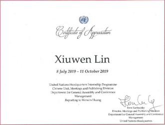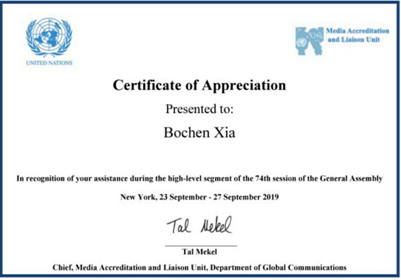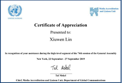 实习期间正值第74届联合国大会的召开,我校三名实习生有幸承担了联合国秘书长工作报告中文译本的编校工作,并通过了联合国全球传播部的选拔成为本届大会的志愿者,荣获“优秀志愿者证书”。ld体育(中国)官方网站博士生夏伯琛感言:“终于有机会可以为祖国做一点力所能及的事,我们会主动引导前来参会的中国代表和媒体到达指定会场。最激动人心的是现场聆听国务委员王毅和联合国秘书长古特雷斯在新中国成立七十周年成果图片展开幕式上的致辞,向世界各国友人分享中国发展进步的辉煌成就。作为一名中国志愿者,强烈的民族自豪感油然而生!”