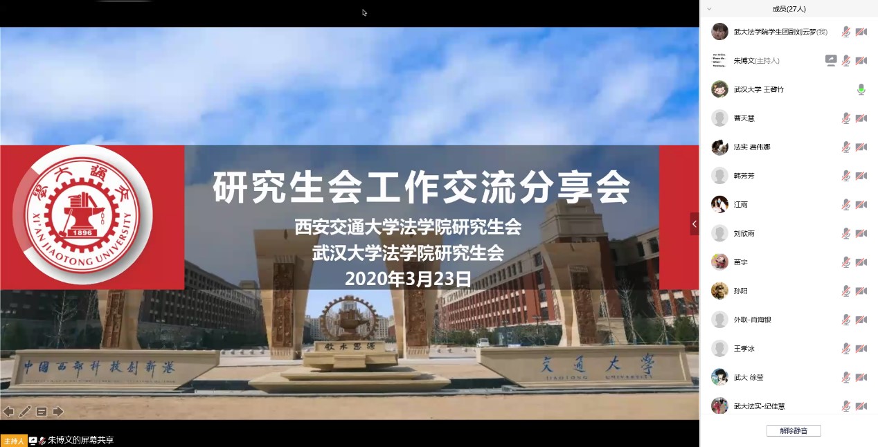 会议伊始,两院研究生会就组织建设、日常工作、精品活动、战疫工作等方面进行了交流。朱博文结合演示文档,图文并茂地向武大同学们介绍了西安交大ld体育(中国)官方网站研究生会的基本情况,研会作为学院党总支领导、团工委指导的综合性学生组织,是学院联系广大同学的桥梁和纽带,从文体、宣传、学术、心理等多个方面为同学们提供全面服务。根据团中央有关文件精神,学院去年对研会组织进行了精简,目前设主席、副主席各一人,分设组织部、宣传部与文体部三个部门,由研会主席、副主席以及部长共同管理,全体干事民主参与。研会先后举办了新港杯辩论赛、法律知识竞赛、冬至饺子宴、迎新冷餐会、元旦嘉年华以及疫情期间的“春之声”法律文化节等精品活动,受到同学们的广泛参与和高度评价,在校内外显著提升了学院的影响力。研会通过对外加强与兄弟院系研会的沟通协调,联合举办大型活动;对内与学院各党支部密切合作,由支部吸收动员入党积极分子参与活动,有效克服了交大ld体育(中国)官方网站学生规模较小,研会部门精简、人力有限对开展活动的制约。