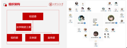 紧接着武汉大学ld体育(中国)官方网站研究生会主席王馨竹也介绍了武大ld体育(中国)官方网站研会的组织架构和职责分工,武大ld体育(中国)官方网站研会始终秉承“自强、求是、弘毅、拓新”的武大精神,为法苑学子提供全方位的服务,调整后的团委及研究生会部门共有10个,包括宣传部、法律实践中心、秘书处、学术编辑部、文艺部、心理部、体育部、权益中心、外联部、就业服务中心。各部门负责人轮流详细介绍了所在部门的日常工作和举办的经典活动,权益中心的权益简报、校领导接待日,秘书处的模拟法庭比赛,外联部的线上自习室、学术编辑部的征文比赛等活动都引起了交大同学们的浓厚兴趣,双方就举办活动中的宣传方案、经费来源、激励机制、时间安排以及学业压力等细节问题进行了深入的探讨。