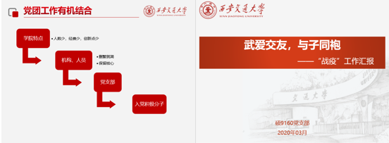 随后的党团工作交流环节,两院有关负责同学分别介绍了党团组织在抗疫期间的主要工作。交大ld体育(中国)官方网站硕9160党支部书记孙阳表示,ld体育(中国)官方网站各支部积极响应习近平总书记重要指示,落实党中央国务院决策部署,对标学校、学院防控要求;加强防疫宣传教育,引导学生带头守法;畅通信息报送渠道,保障日报制度运行;分享线上学习资源,配合做好线上授课筹备工作,号召同学在导师指导下深入研究疫情相关法律问题;倡导党员服务社区,组织党员捐款捐物。武大ld体育(中国)官方网站团委学生副书记刘云梦表示,自疫情发生以来,学院迅速成立以党委统一领导、统一指挥的疫情防疫工作小组,形成了党总支、党支部、党员个人三级联动的有力防控网络,从理论学习、思想引领、基层服务多领域开展抗疫工作。团支部积极响应,组织学习“青年大学习”团课,开展主题团日活动,鼓励团员青年积极投身防疫工作,发挥团员的生力军作用。