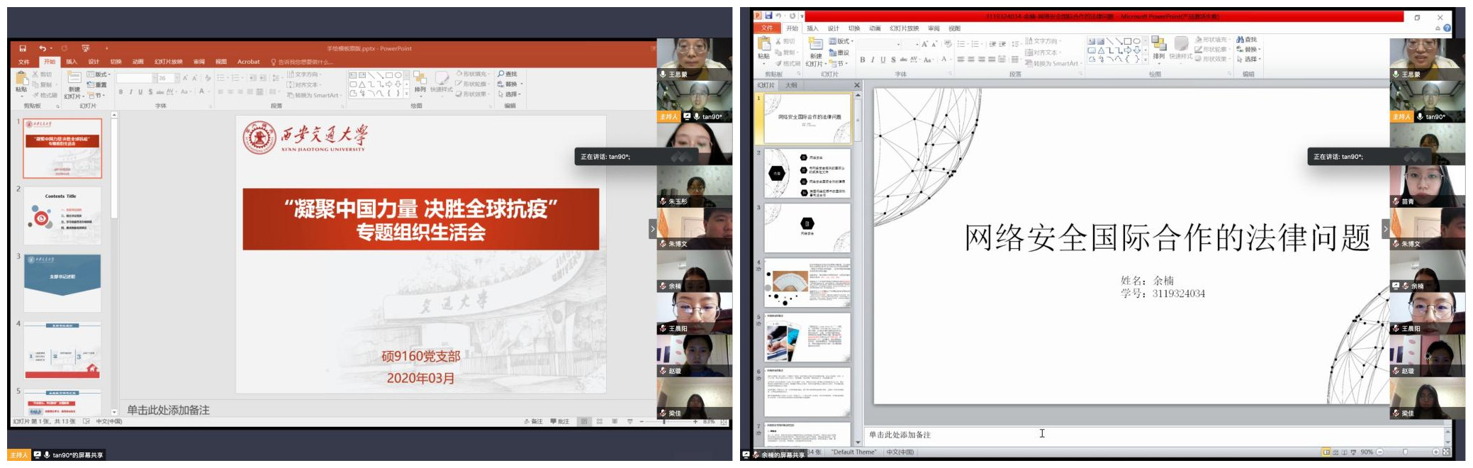 3月23日晚,西安交大ld体育(中国)官方网站与武汉大学ld体育(中国)官方网站联合举办“武爱交友,与子同袍”分享交流会,朱博文、孙阳分别就研会建设、支部工作与武大同学分享心得、畅谈经验,两校法科学子对近期“抗疫”工作展开热烈讨论。“武大ld体育(中国)官方网站研会组织健全完善,活动丰富多彩,各位同学的分享干货满满,令人受益匪浅”,支部党员、ld体育(中国)官方网站研会主席朱博文表示,“我们将组织专题研究,吸收借鉴有益经验,更好地为交大同学们服务”。“武大医学部白衣执甲、坚守阵地,交大医学部逆行出征、千里驰援,共同凝聚起抗击疫情的钢铁长城”,孙阳在总结发言中表示,“待疫情散去、山河无恙之时,希望大家可以实地交流,轻抚兴庆湖畔的秦砖汉瓦,品味珞珈山上的荆风楚韵。”
