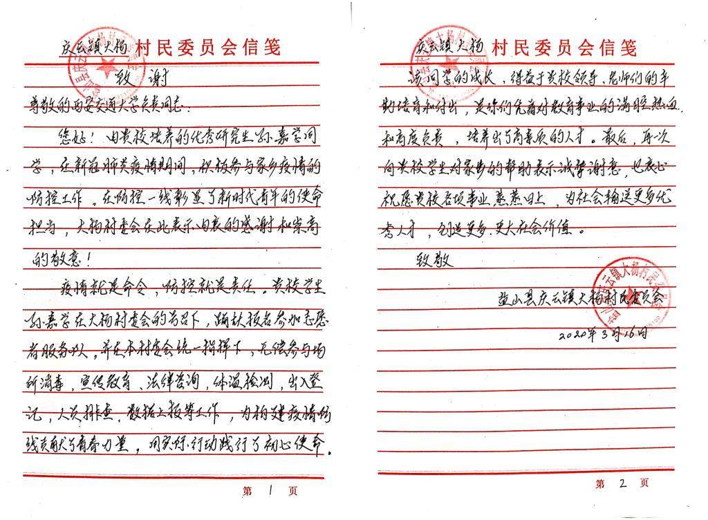 近日,一封特殊的来信悄然落至交大。西交ld体育(中国)官方网站学生——孙嘉学在家乡疫情防控攻坚战中不仅身体力行做好各项基础工作,更发挥自身专业为群众普及相关法律知识,为控制疫情贡献青春力量。庆云镇大杨村特向ld体育(中国)官方网站邮寄了一封手写感谢信,字里行间饱含对交大领导、老师的真挚谢意。