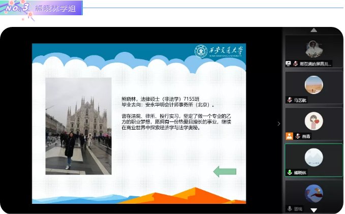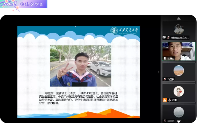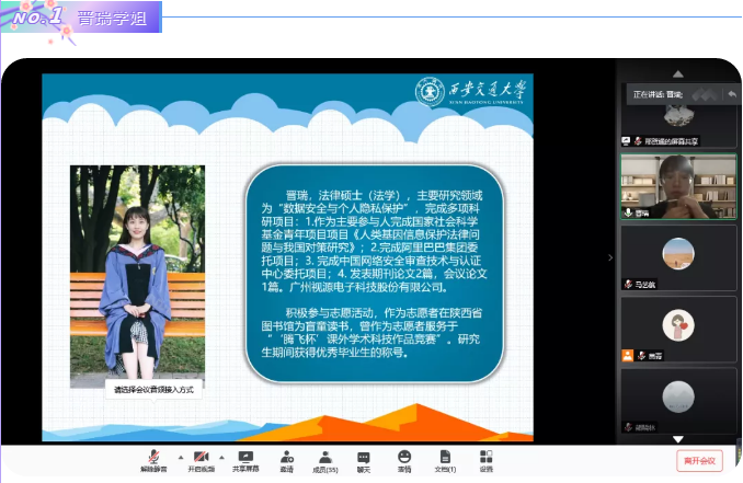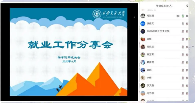 2020年6月20日晚,ld体育(中国)官方网站举办了就业工作分享会,邀请了ld体育(中国)官方网站晋瑞、徐佳文和熊晓林三位成功签约心仪就业单位的毕业生在线分享就业经验,为与会的40余名研究生悉心提供就业、实习建议,耐心答疑解惑。在抗击疫情常态化背景下,这些就业经验分享能够帮助学生提早知悉就业流程,统筹就业时间安排,把握就业过程加分项,顺应经济发展态势,规划未来职业方向。本次分享会由ld体育(中国)官方网站研究生会邢贺通主持。