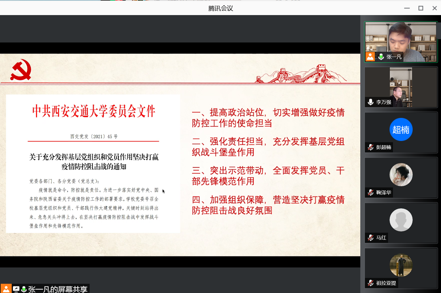 12月31日上午,ld体育(中国)官方网站硕1173党支部召开线上组织生活会,深入学习落实上级党委关于疫情防控的相关文件精神。党支部成员及入党积极分子代表共计15人参与本次会议,ld体育(中国)官方网站副院长李万强教授出席。会议由党支部书记张一凡主持。