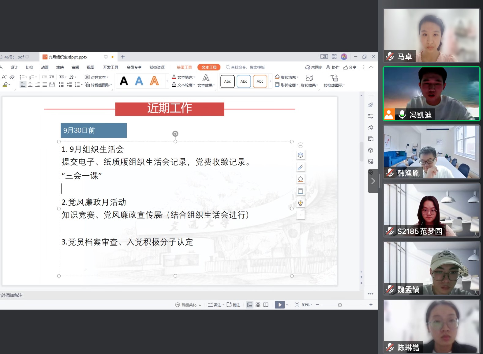 首先,党支部书记冯凯迪同志向大家汇报了支部整体情况、支委组成人员以及近期的工作进展,通报了近期开展的党员档案审查、入党积极分子认定以及廉洁文化宣传月活动等。冯凯迪同志还介绍了“三会一课”组织生活制度,强调将高度重视支部建设,严格落实各项制度,开展形式多样、内涵丰富的支部活动。